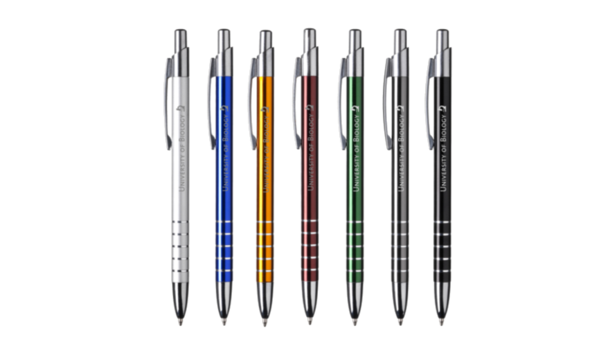 Blauschreibender, Aluminium-Kugelschreiber mit • schlankem Gehäuse in Metall-Optik • Metall-Clip • Zwischenringen.